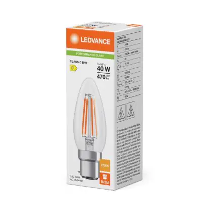 Beschrijving Ledvance Classic LED B22 Kaars Filament Helder 3.4W 470lm - 827 Zeer Warm Wit | Vervangt 40W